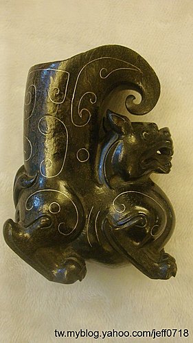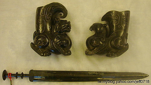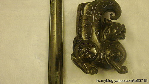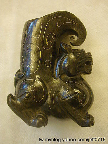 一對青玉質、表面處理、全面染黑、嵌銀絲之龍鳳玉觥,底部落款建元,通體染黑,仿秦代青銅劍表面特殊處理後,兩千多年後依舊烏黑亮麗。