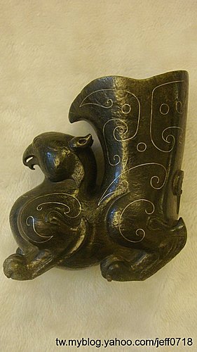 所分享為一對青玉質、表面處理、全面染黑、嵌銀絲之龍鳳玉觥,底部落款建元,造型仿犀角,口呈豬籠草狀,觥杯末端為螭龍與鳳鳥為座,體嵌銀絲,玉質堅硬,鐵釘聲,造型新穎獨特,動物威猛,通體滲碳染黑,仿秦代青銅劍表面特殊處理後,兩千多年後依舊烏黑發亮。現今製造技術有陽極處理,電鍍染黑,早在兩千多年前秦漢就能使用特殊表面處理方法,達到現今技術才能作到防腐蝕與增加硬度的技法,甚至比之效果更加好,能不令人瞠舌與讚嘆!