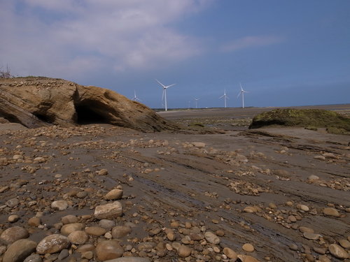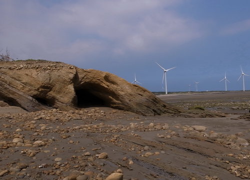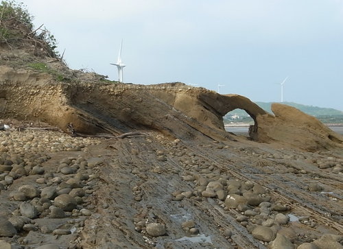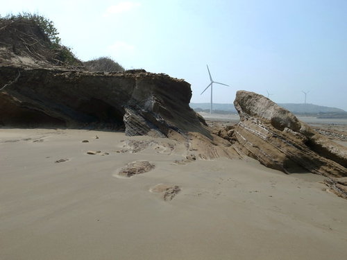 校外教學最佳地球科學景點,往上依次為 ~ 傾斜地層、海蝕洞,不整合面,礫石、砂丘、砂丘上的植物。