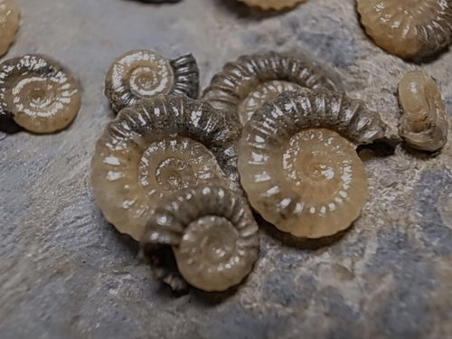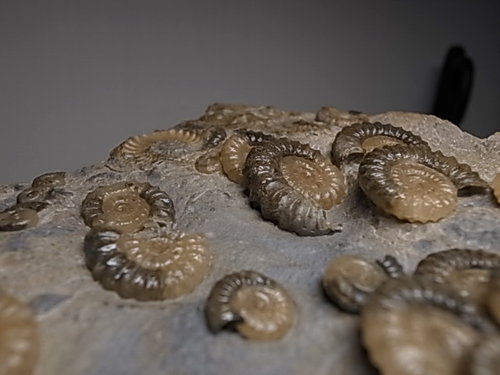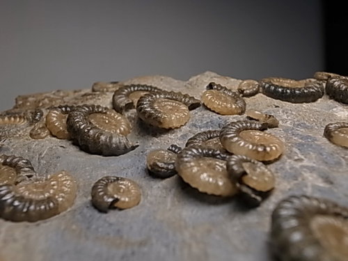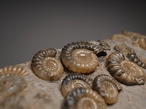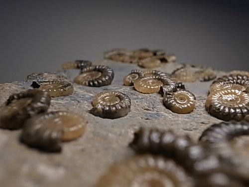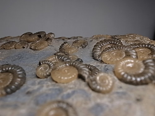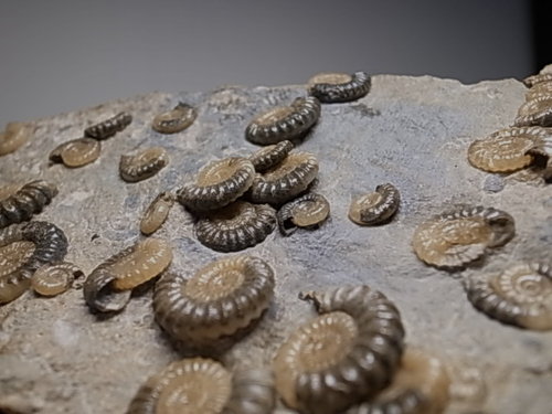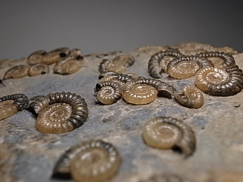 下面這塊群體原微菊石標本也是產自英國西南部,就在 多塞特郡靠西北方向的 薩默塞特郡 ( Somerset )。雖然產區不同,菊石氣室也是完全方解石化,而且菊石重疊的相當有意思... 雖然原微菊石是平價的化石,但其簡潔有力的肋條、平實的外型,確實令人百看不厭 !!