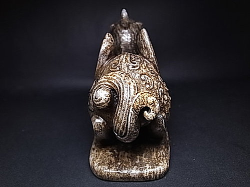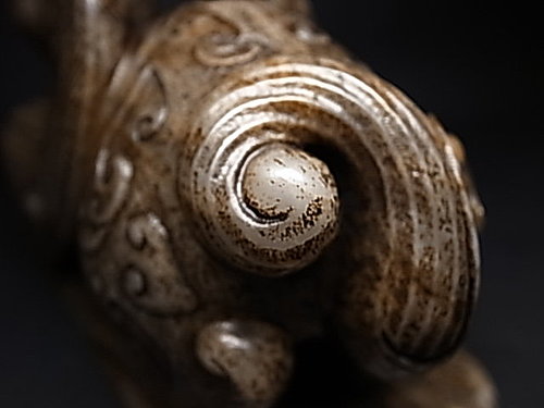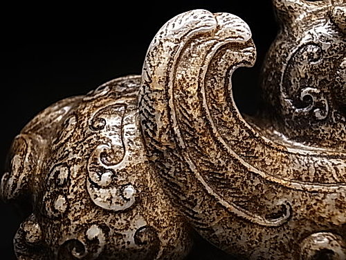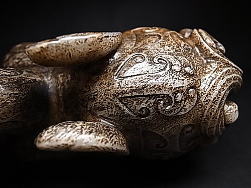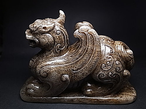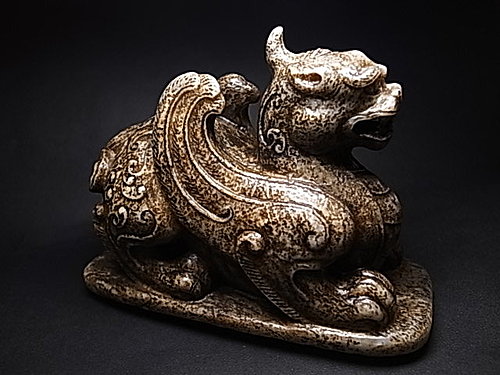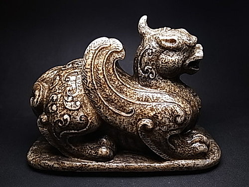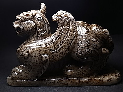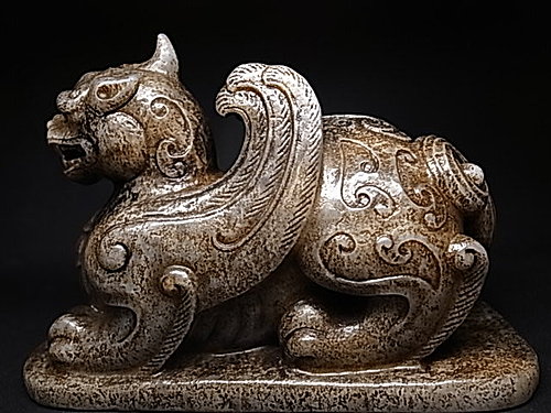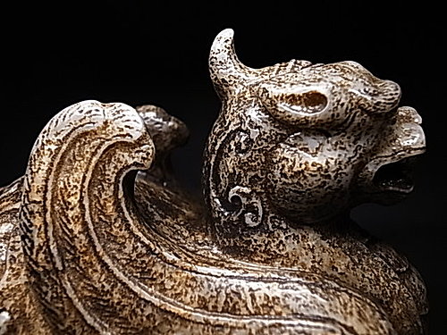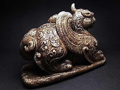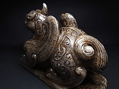 稀有的獨角造型,前足兩側延伸有雙翼。頸部及後軀 ~ 飾以淺浮雕雲纹和陰刻雲纹。