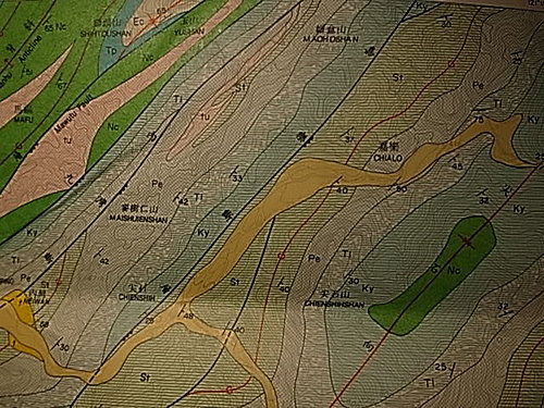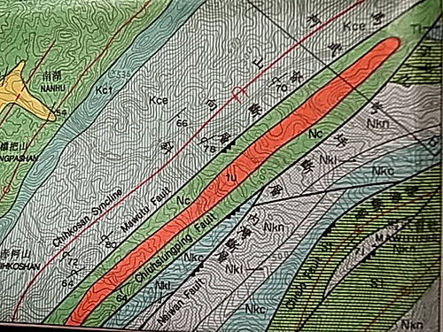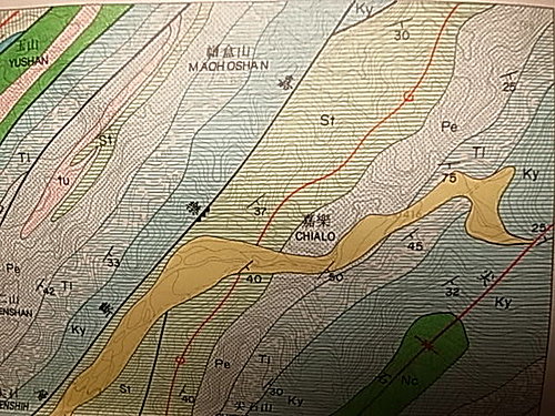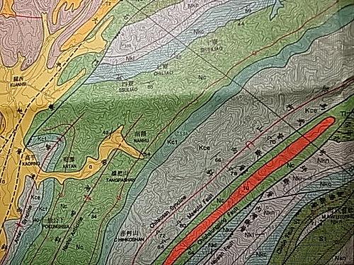 目前台泥石礦、玉山石礦均已植被,有可能成為生態園區,早期這些結晶石的出土位置都已被挖掘消失… 謹以此地質簡圖請專家能協助講解。