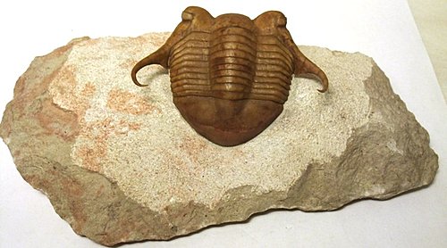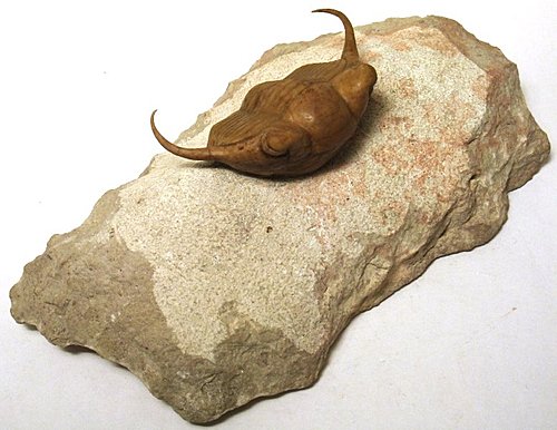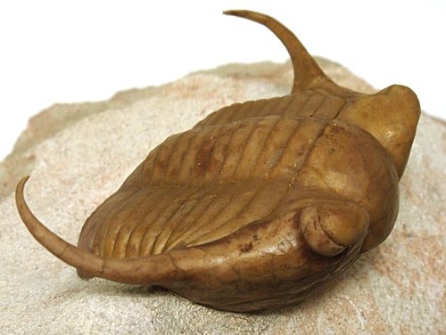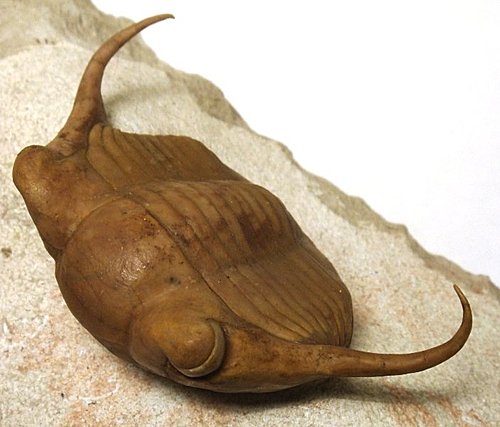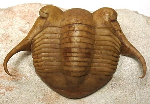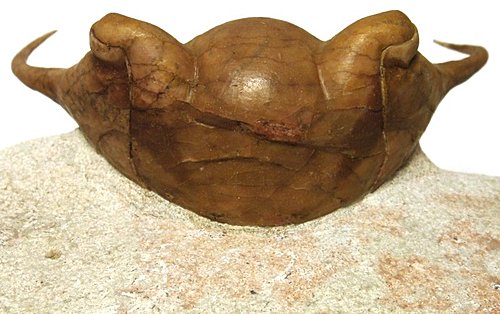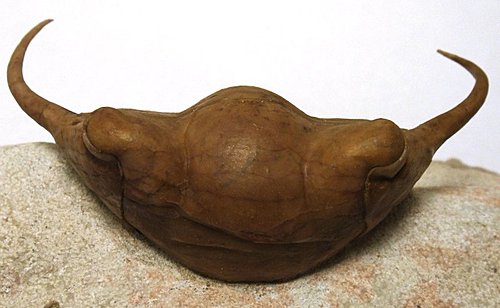 這隻牛角斜視蟲頭部受地層的擠壓,略為輕度變形。除了頰刺有接補 ( repair ) 之外,其他部位完美無修復 ( No restoration ), 這在蘇聯三葉蟲算是相當難能可貴的。請大家慢慢欣賞…