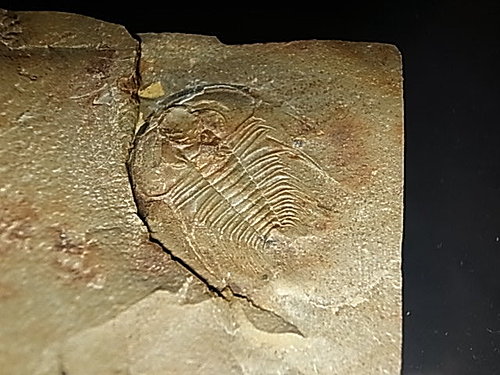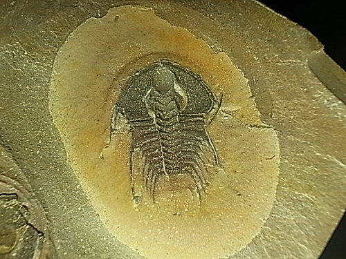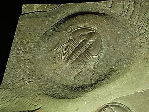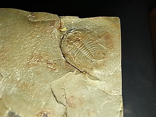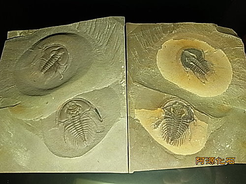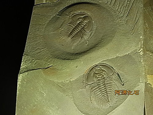 這件標本是 " 當三葉蟲統治世界 " 書裡頭所描述,第一個上場的寒武紀早期普遍的三葉蟲 ~ 小油櫛蟲。小油櫛蟲是原始的三葉蟲,頭甲尚未發展出有助於脫殼的面線。小油櫛蟲雖然十分古老,但是牠的大頭已經有一對狹長的月形眼睛。