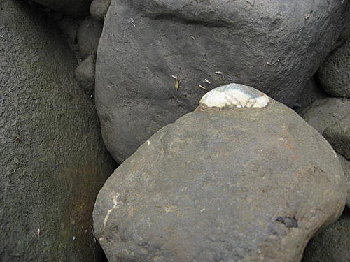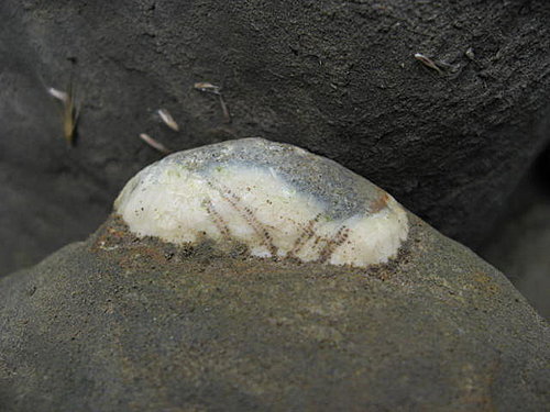 在平溪河床撿到的原石模樣,原石下方那一顆海膽是腹面 ( 口面 ),上方的是背面 ( 反口面 )